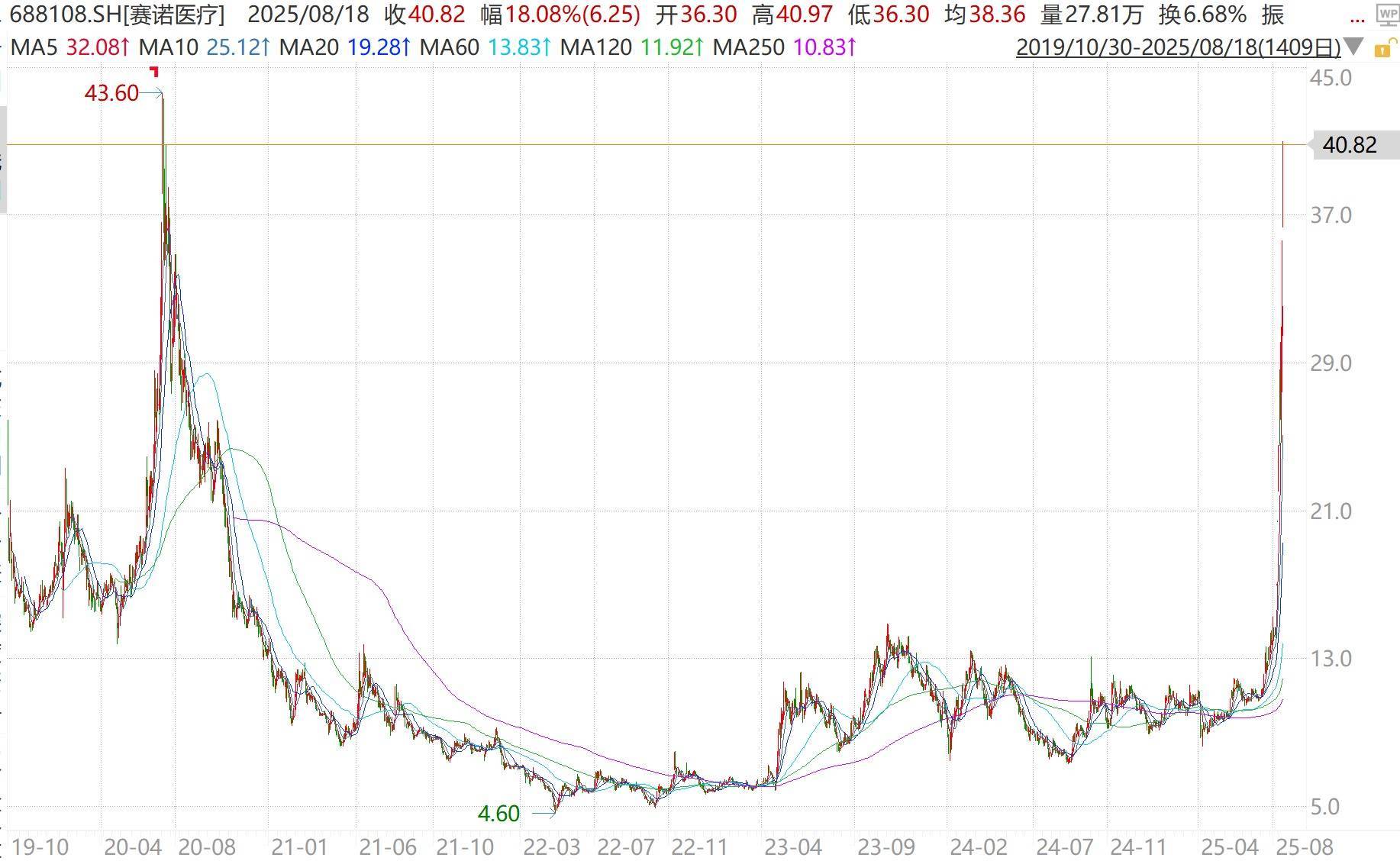 从2019年10月在科创板上市,赛诺医疗也就在2020年7月时摸到过43块,称得上近年来唯一的“高光”时刻。因为自那以后赛诺就一路往下走,直到今年4月份才有点“触底反弹”的意思。