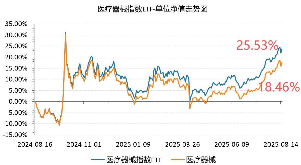 截至最新,这个ETF是相同标的ETF中年内涨幅最高的,最近10个交易日内获得近1亿的资金“净流入”。8月18日,刚开盘半小时,医疗器械指数ETF(159898)又获得1800万份的大额申购。