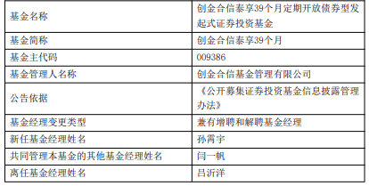 中国经济网北京6月24日讯今日,创金合信基金公告,创金合信泰享39个月增聘孙霄宇,吕沂洋离任。